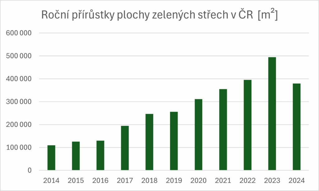 Zatímco v roce 2023 činil roční přírůstek rekordních 495 000 m², v roce 2024 to bylo přibližně 380 000 m². Tento pokles má podle odborníků i zástupců trhu více příčin. Projevily se zpožděné důsledky pandemie COVID-19 a války na Ukrajině, které v uplynulých letech vedly k odkládání nebo rušení projektů. Část investorů postrádala připravené zakázky, které by navázaly na ty předchozí. Zásadní roli hrály také ekonomické faktory – vysoká inflace, růst cen materiálů, drahé financování i škrty v rozpočtech developerů. Vegetační střechy byly bohužel jedním z prvních opatření, které bylo často z projektů vyřazováno kvůli úspoře nákladů. K situaci přispěly i strukturální změny na trhu – část projektů, pozastavených v letech pandemie, se realizovala rychle v roce 2023, což mohlo způsobit krátkodobý pokles nové výstavby v roce následujícím. Ve větších městech přibývají regulativy, které vegetační střechy podporují, a roste zájem o kvalitní vícefunkční řešení. Stále častěji se uplatňují intenzivní střechy, kombinace s retenčními systémy nebo návrhy zaměřené na podporu biodiverzity. Trh je tak připraven na další rozvoj – pokud mu budou přát ekonomické podmínky i veřejné investice.